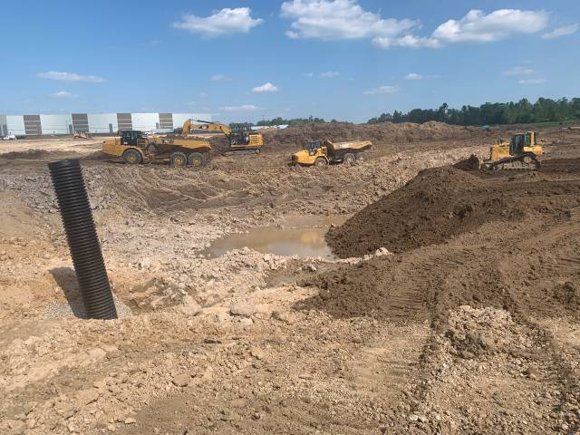 The project itself featured two large industrial buildings—a 218,000 square foot main building and a smaller “truck maintenance” building. TE crews moved nearly 200,000 cubic yards of dirt onsite by the time the job was done. Thornapple’s pipe crew installed almost 10,000 linear feet of underground utilities and 41 precast concrete structures of various sizes. Crews also imported and placed about 41,000 tons of 21AA limestone under more than 16 acres of paved surfaces. Overall, there were roughly 26 total acres of disturbed ground.