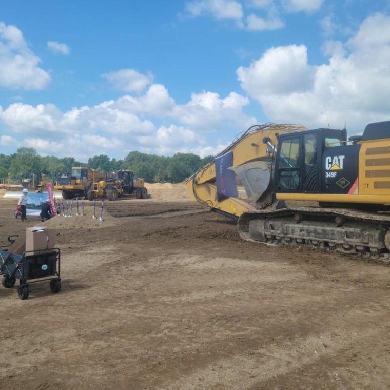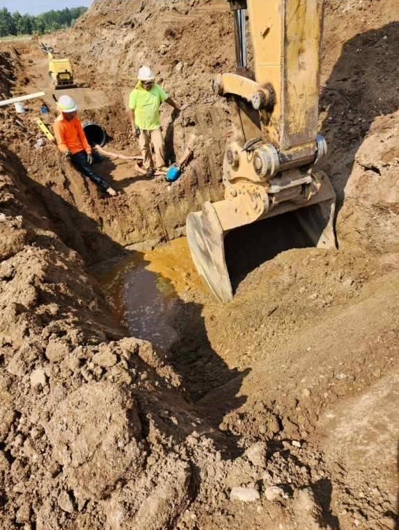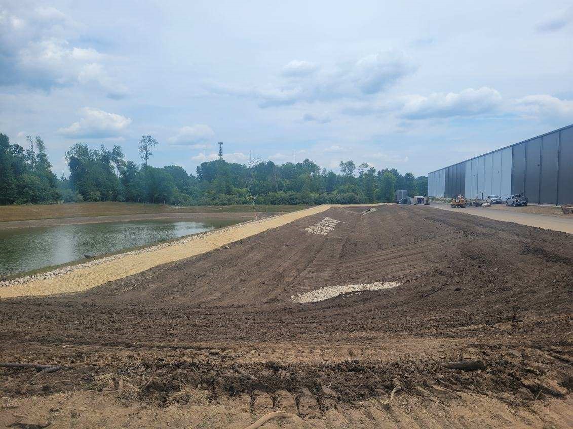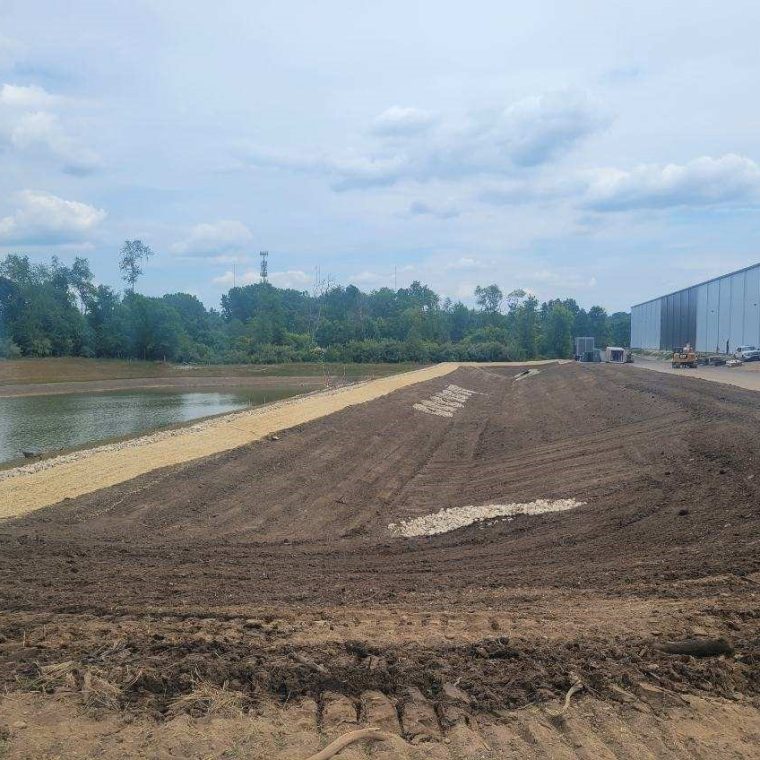 We also installed an interesting stormwater retention system on this job. Rather than underground retention, this design called for a watertight liner to be installed inside the three-acre pond to hold water onsite instead of percolating into the soil like a typical retention pond. The crew then installed a thick layer of topsoil to hide the liner, giving the same visual result of a normal pond.